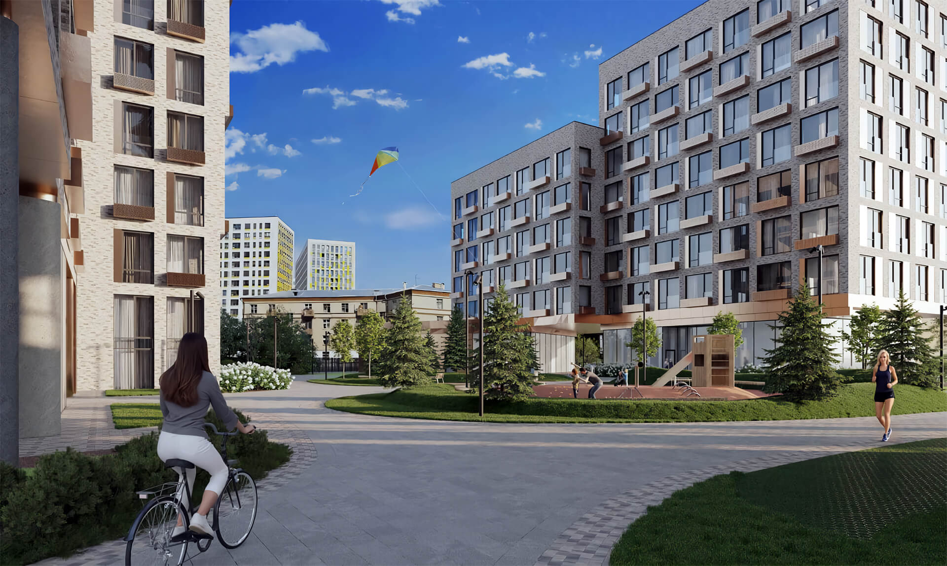 Внутреннее пространство разделено на несколько функциональных зон. Для детей разных возрастов обустроены современные игровые площадки с безопасным покрытием, горками, качелями и лазательными комплексами. Спортивные площадки оборудованы тренажёрами, турниками и зонами для воркаута, что позволяет жителям поддерживать активный образ жизни.