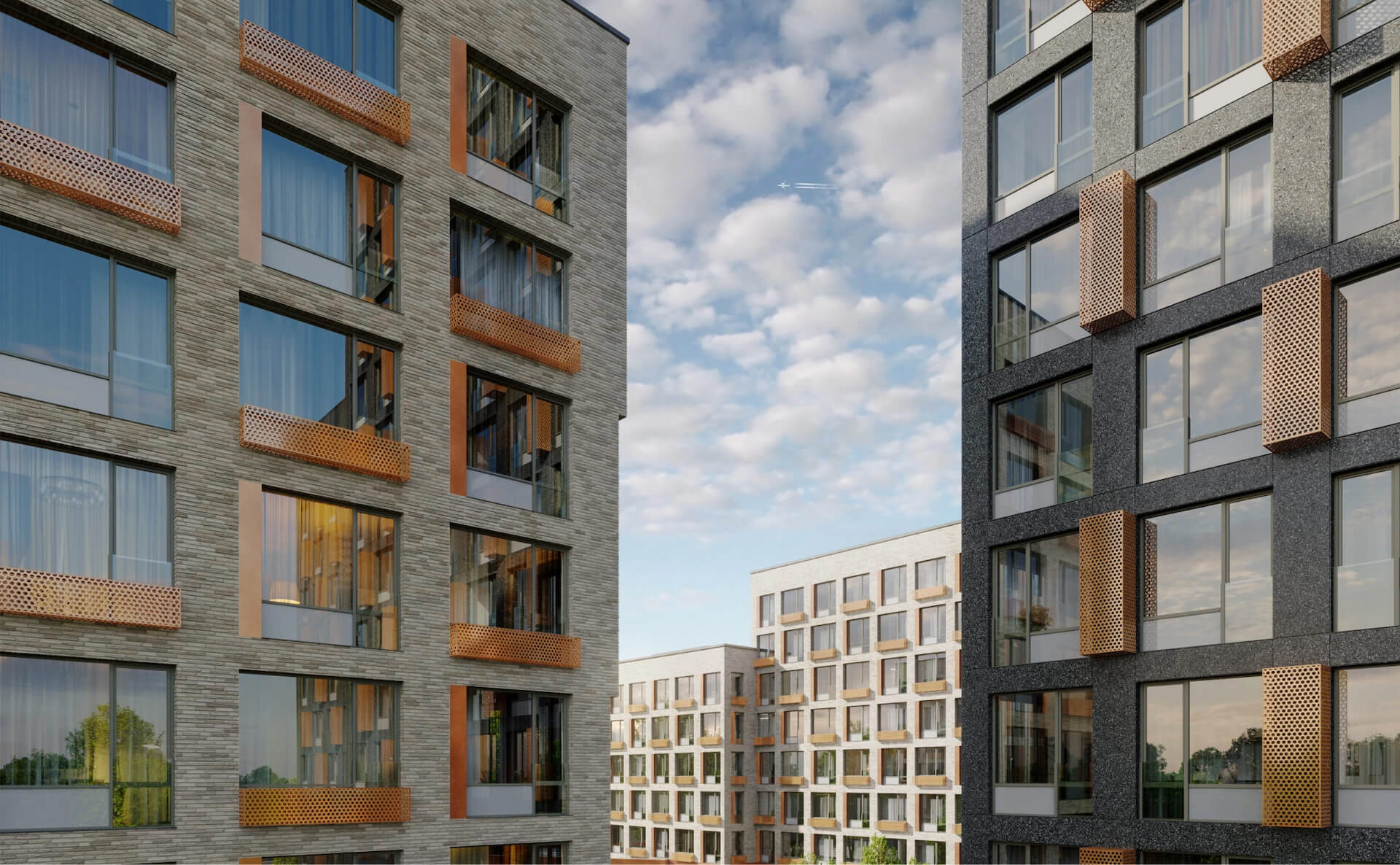 Архитектура комплекса отличается гармоничным сочетанием натуральных материалов – архитектурного бетона, клинкерной плитки и медных панелей, что подчёркивает связь с природой. Уникальный фасад, вдохновлённый формой сосновой шишки, выделяет Champine среди других новостроек столицы. Ландшафтный дизайн внутренних дворов разработан с учётом концепции природного комфорта, где каждый элемент пространства способствует расслаблению и восстановлению после насыщенного дня.