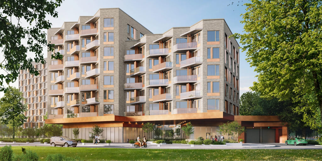 Архитектурное бюро APEX разработало концепцию Champine на основе природного функционализма, который подчёркивает связь города и природы. Три корпуса разной этажности формируют уютное закрытое пространство с благоустроенным внутренним двором. Используемые в отделке фасадов архитектурный бетон, клинкерная плитка и медные панели создают естественную цветовую палитру, которая гармонично вписывается в окружающую застройку.