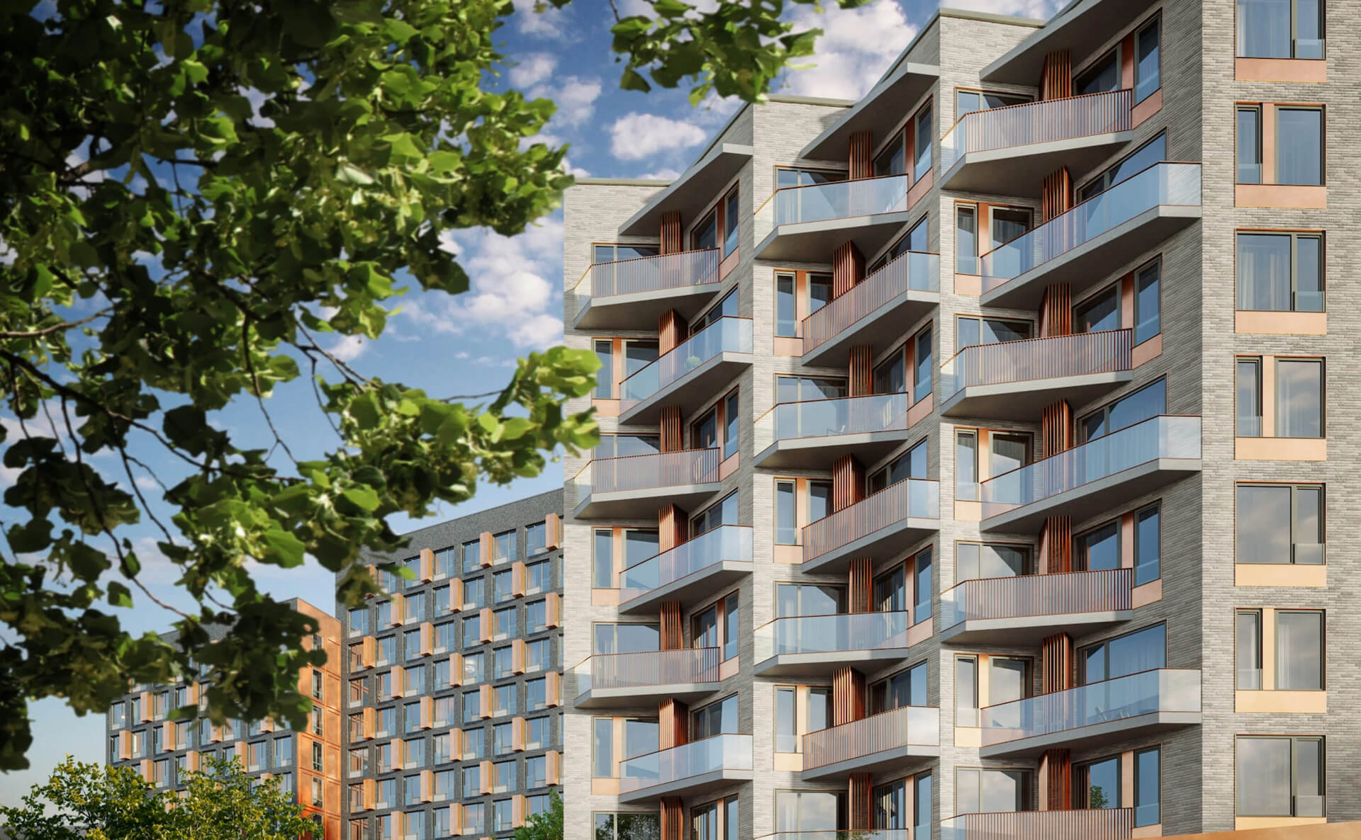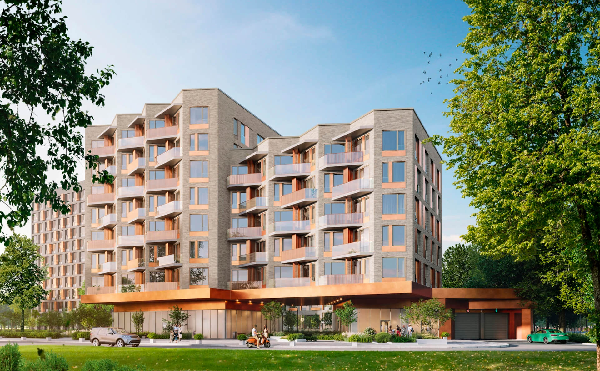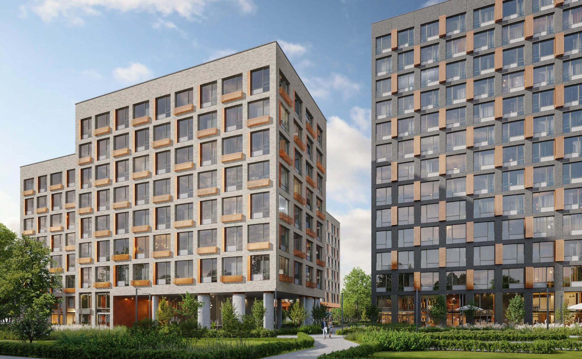 Архитектурное бюро APEX разработало концепцию Champine на основе природного функционализма, который подчёркивает связь города и природы. Три корпуса разной этажности формируют уютное закрытое пространство с благоустроенным внутренним двором. Используемые в отделке фасадов архитектурный бетон, клинкерная плитка и медные панели создают естественную цветовую палитру, которая гармонично вписывается в окружающую застройку.