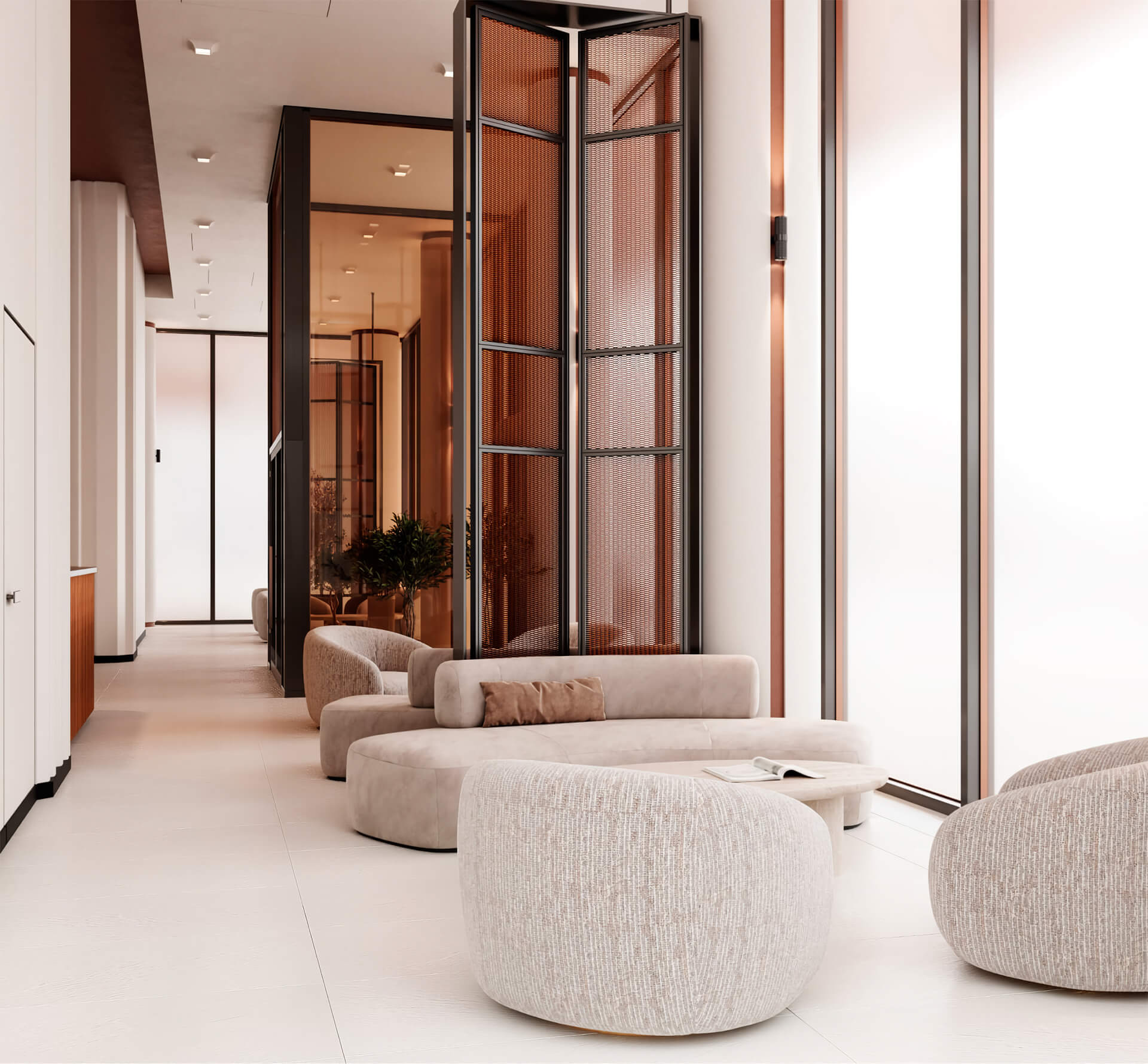 Лобби разделены на несколько функциональных зон. Гостевая зона с мягкими креслами и живыми растениями создаёт уютную атмосферу. Ресепшн оборудован современными системами коммуникации для удобства жителей и их гостей. Возле лифтов предусмотрены зоны ожидания. В каждом корпусе есть колясочные и кладовые помещения, а также комнаты для хранения велосипедов и мойки лап домашних животных.