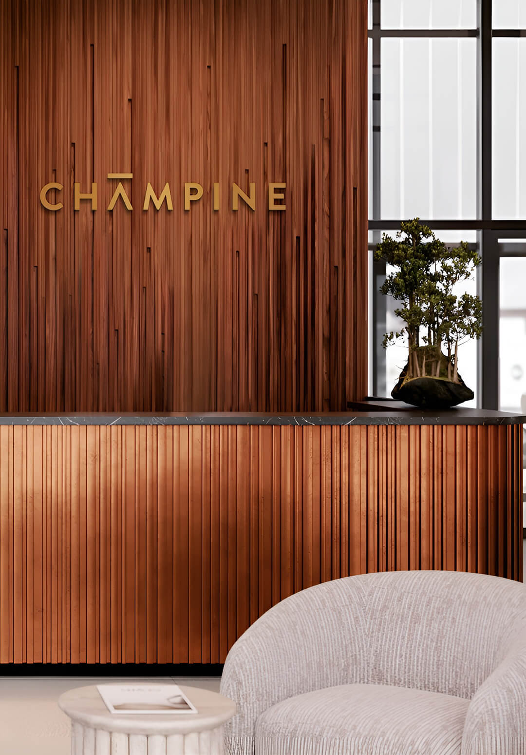 Входные группы Champine выполнены в премиальном дизайне, разработанном студией Balcon. В интерьере лобби использованы натуральные материалы, создающие ощущение уюта и роскоши. Высокие потолки, панорамные окна и декоративные элементы в виде медных ламелей и геометрических панелей наполняют пространство светом и воздухом.